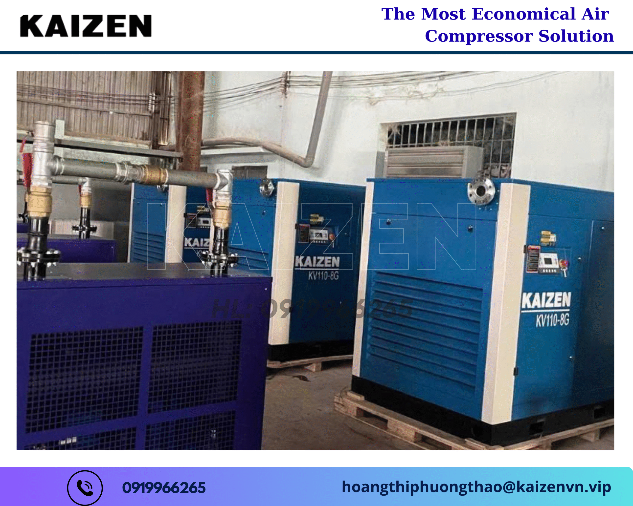 Chọn máy nén khí trục vít 110KW 150HP KAIZEN, doanh nghiệp không chỉ chọn một thiết bị – mà chọn một giải pháp bền vững, nơi hiệu suất gặp niềm tin, công nghệ song hành cùng giá trị lâu dài.