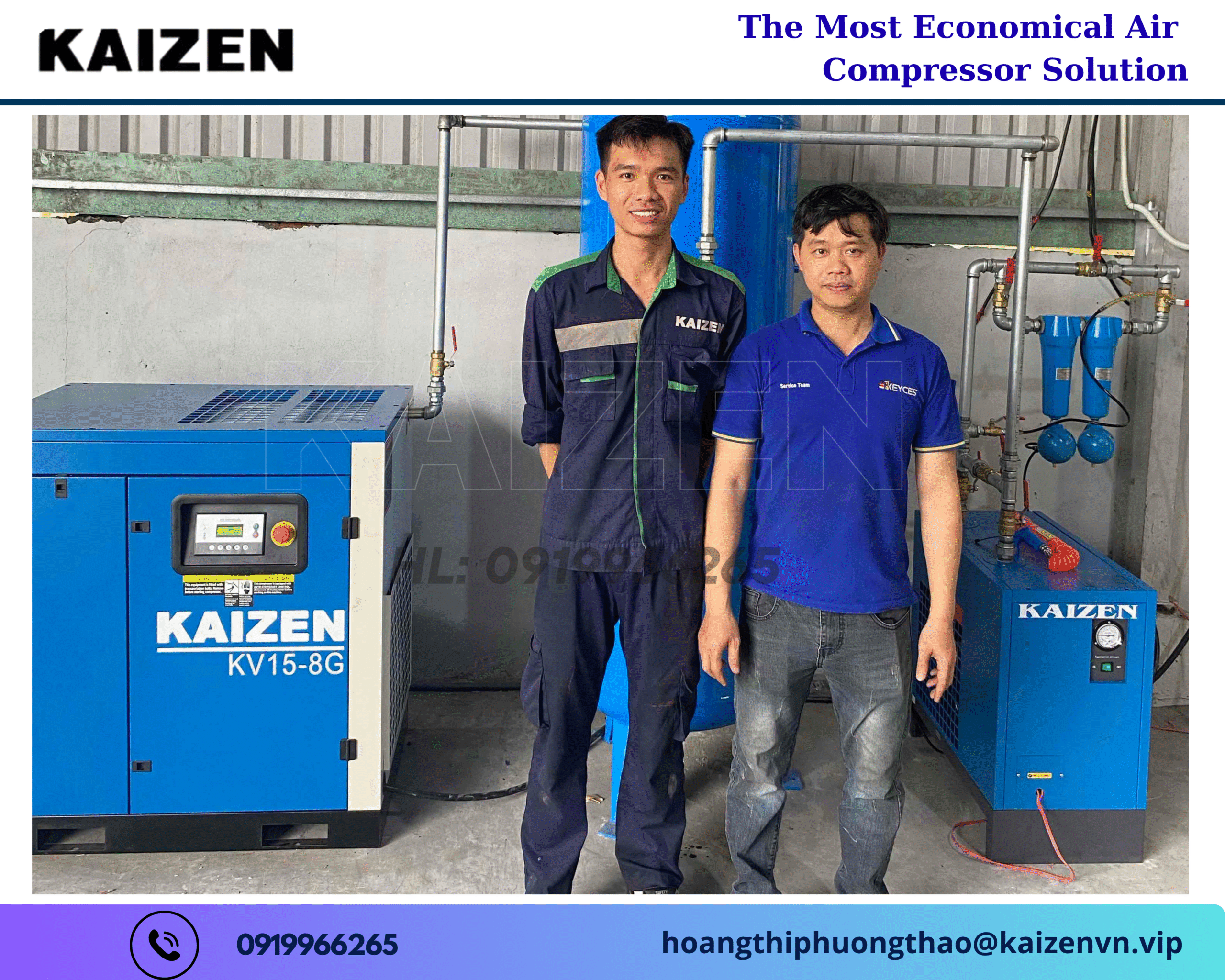 Với đội ngũ kỹ thuật viên giàu kinh nghiệm, hệ thống bảo hành – bảo trì toàn quốc và chính sách chăm sóc khách hàng tận tâm, KAIZEN cam kết mang đến sự an tâm tuyệt đối cho mọi nhà xưởng khi đầu tư vào dòng máy nén khí trục vít 15KW 20HP.